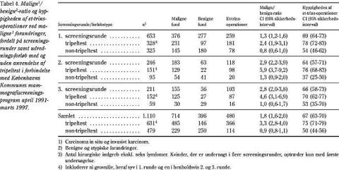 I den samlede evalueringsperiode var malign/benign-ratioen 1,8 (Tabel 4). Fordelt på screeningsrunder forbedredes malign/benign-ratioen fra 1,4 i første screeningsrunde til 2,8 i tredje. Andelen af cancerpatienter, der blev sendt til kirurgisk excisionsbiopsi øgedes fra 58% (376/653) i første screeningsrunde til 73% (155/211) i tredje (Tabel 4). Ved udredningsforløb, hvor der var anvendt tripeltest, opnåedes en yderligere forbedret malign/benign-ratio i alle tre screeningsrunder, fra 2,4 i første screeningsrunde til 4,6 i tredje. Herved øgedes andelen af patienter med brystkræft fra 70% (231/328) i første screeningsrunde til 82% (125/152) i tredje.
