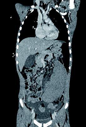 Klinisk er diagnosen vanskelig. Derfor skal US med farve-Doppler og CT med i.v.-kontrast udføres hurtigst muligt. Husk hurtig gennembladning af CT-billederne.