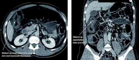 En 48-årig mand blev indlagt med en verotoksinproducerende Escherichia coli (VTEC)-gastroenteritis, som han havde erhvervet i Tyskland. Patienten blev indlagt på grund af tiltagende mavekrampelignende smerter og blodige afføringer. Han fik foretaget akut computertomografi af abdomen. Skanningen viste patologisk vægfortykkelse af colon ascendens og transversum med transmural inflammation samt caecum dilateret til 8 cm. På billederne ses en vægfortykket og dilateret colon ascendens med transmural inflammation. Man valgte at observere patienten natten over, men da smerterne tiltog i det første døgn under indlæggelsen, foretog man en oversigt over abdomen, der viste en tiltaget caecum dilatation på op til 15 cm. Abdominalkirurgerne foretog akut højresidig hemikolektomi, da caecum var perforationstruet. Patologisvaret viste forandringer, der svarede til en pseudomembranøs enterokolitis. Operationen og det postoperative forløb, hvor patienten fik meropenemtrihydrat 1 g × 3 dagligt i fem dage, var ukompliceret.