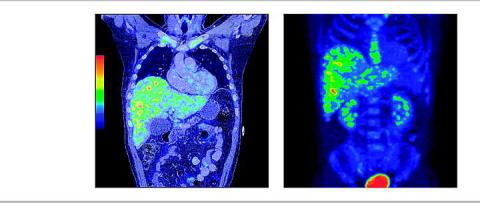 Positronemissionstomografi (PET)/computertomografi (CT) viser multiple opladende processer i leveren. Det aksiale skelet oplader pga. øget metabolisme i regenererende knoglemarv. Nyrer og urinveje oplader pga. udskillelse af traceren (18 F-deoxy-glukose).