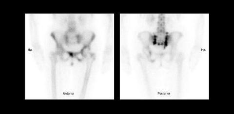 Tc-HDP viser en bilateral, såkaldt insufficiensfraktur i bækkenet foruden løshed af venstresidig hofteprotese.