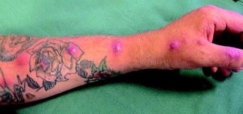 En 51-årig tidligere rask mand blev henvist til dermatologisk ambulatorium. Patienten havde seks måneder forinden fået en enkelt nodulus på venstre tommelfinger efter at have renset sit ferskvandsakvarium. Efterfølgende var der med ugers interval tilkommet nye, absceslignende noduli, der bredte sig proksimalt op ad underarmen. En biopsi viste granulomatøs inflammation, og der var positiv Quantiferontest. Dyrkning for mykobakterier var negativ. På mistanke om swimmingpoolgranulom blev der iværksat behandling med rifampicin, ethambutol og clarithromycin, og patientens hudsymptomer forsvandt gradvist og fuldstændigt i løbet af de næste tre måneder. Patientens tatovering er uvedkommende for sygehistorien.