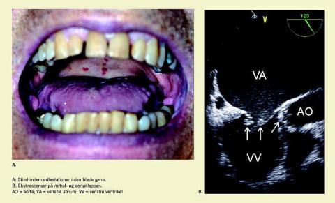 Akut ekkokardiografi viste tegn på ekskrescenser (B) på både mitral- og aortaklappen med destruktion af begge hjerteklapper. I bloddyrkningen fandtes Enterococcus faecalis. Patienten blev overført til en specialafdeling, hvor der blev foretaget aorta- og mitralklapssubstitution med henholdsvis homograft og mekanisk protese.