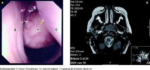 En 22-årig kvinde blev henvist akut fra egen læge til en øre-næse-hals-afdeling grundet kraftig venstresidig epistaxis. Patienten var gravid i uge 38. Hun havde desuden nedsat luftpassage i venstre næsebor og havde haft venstresidig hørenedsættelse gennem to uger. Efter oprensning og hæmostase med ætsning af næseslimhinden i overfladeanæstesi fandt man ved rinofaryngoskopi med optik en prominerende tumor i rhinopharynx (Figur 1A). Tympanometri viste en flad kurve, hvilket var foreneligt med væske i venstre mellemøre. Ved otomikroskopi fandt man væske bag trommehinden, hvilket tyder på tubaokklusion. Biopsi fra tumoren i næsesvælget viste adenokarcinom, lymfoepitelialt karcinom. Magnetisk resonans-skanning af hoved/hals viste en 2,2 × 3,2 × 2,3 cm stor tumor i rhinopharynx (Figur 1B), samt en 2,6 cm stor lymfeknude på venstre side af halsen, sidstnævnte bekræftet ved ultralyd af collum. Røntgen af thorax viste normale forhold. Fundene svarede således til T1 N1 M0 rhinopharynxcancer. Efter konference med en onkolog og en obstetriker afventede man normal fødsel, hvorpå patienten påbegyndte radiokemoterapi (66 Gy/33 fraktioner/cisplatin). Ved klinisk etårskontrol inkl. fiberskopi og ultralyd af halsen var patienten recidivfri.