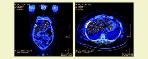 En 39-årig mand var blevet behandlet for non hodgkin-lymfom (diffust storcellet B-celle-lymfom) med godt resultat. Ved en positronemissionstomografi (PET)/computertomografi (CT) med 18 fluordeoxyglukose (FDG)-undersøgelse i februar 2007 bekræftedes remissionen, men der var dog uændret kraftigt øget FDG-aktivitet nedadtil i højre lungefelt, på figuren ses en koronal og en transversel optagelse, og bagtil ved diafragma (retrokruralt). Biopsi fra det retrokrurale focus viste fremmedlegemereaktion.