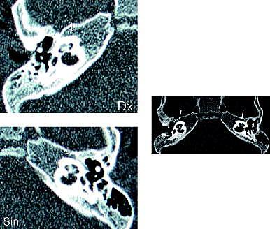 En computertomografi viste bilateralt udtalt sklerosering omkring cochlea, buegange og pori (angivet med pile). Patienten blev indstillet til bilateral implantation af elektroder i cochlea (Cochlear Implant (CI)) mhp. elektronisk stimulation af nervus cochlearis for at opnå hørelse. Hun blev opereret tre måneder efter sygdomsdebut, hvor det pga. den udtalte sklerosering kun var muligt at introducere seks ud af 22 mulige elektroder på højre side og ingen elektroder på venstre.
