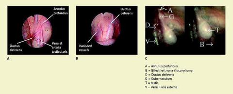 Billederne viser en intraabdominal testis beliggende lige inden for annulus profundus, en normalt udseende lyske med testikelkar og ductus deferens samt en vanished testis, hvor blodkarrene til testis ses som penselstrøg.