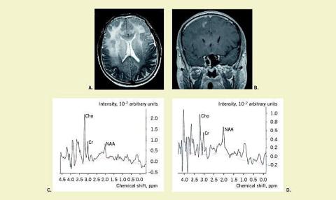 En 43-årig tidligere rask mand blev indlagt efter i et halvt år at have haft symptomer i form af hovedpine, demens og krampeanfald. En magnetisk resonans (MR)-skanning af cerebrum viste udbredte signalforandringer i begge frontotemporallapper (Figur 1A) med et enkelt kontrastopladende område i højre frontallap (Figur 1B). Efterfølgende paraklinisk undersøgelse af blod og cerebrospinalvæske viste normale forhold. Supplerende MR-spektroscopi (MRS), single voxel spektroskopi med pulssekvensen PRESS (TR/TE = 2.000 ms/31 ms), viste yderligere eleveret kolin i det kontrastopladende område (Figur 1C) sammenlignet med den kontralaterale side (Figur 1D), hvilket tyder på en malign tumor, og på at området er et muligt hot spot i en tumor. Stereotaktisk hjernebiopsi i det kontrastopladende område viste glioblastoma multiforme (WHO-grad IV).