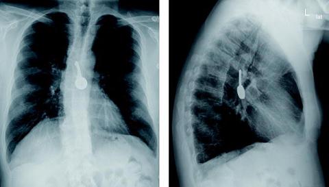 Ovenstående sygehistorie illustrerer vigtigheden af kontroløsofagoskopi distalt for området, hvor et fremmedlegeme er blevet fjernet. Røntgenoptagelse af thorax med fremstilling af fremmedlegemer bør være i to planer, så tilstedeværelsen af flere fremmedlegemer ikke overses [1, 2]. Selv med røntgenoptagelse i to planer kan flere fremmedlegemer dog - i sjældne tilfælde som vores - fejltolkes som et enkelt fremmedlegeme [3].