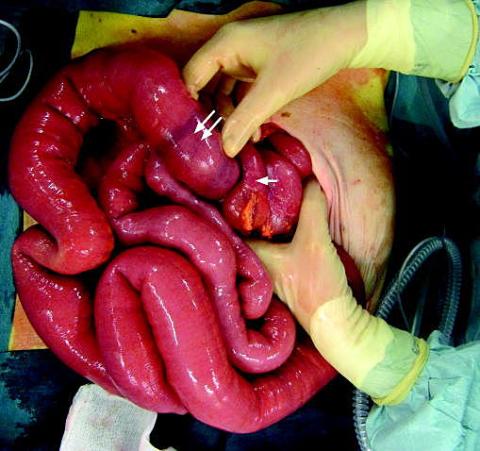 En 81-årig kvinde blev indlagt på grund af to uger varende abdominale smerter og obstipation. Efter to døgn blev patienten udskrevet til plejehjem, men blev genindlagt tre dage senere pga. påvirket almentilstand, tiltagende abdominale smerter og flere vandige afføringer. En oversigt over abdomen viste tyndtarmsileus. Der blev foretaget eksplorativ laparotomi, hvor man fandt invagination af ileum (stor dobbeltpil) ind i caecum og derefter i colon ascendens, colon transversum og i colon descendens (lille pil). Invaginationen blev reponeret. Colon blev bedømt vital og uden tegn på malignitet. Tre døgn postoperativt gik patienten ad mortem pga. kardiovaskulære komplikationer.