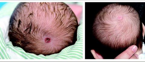 En pædiater blev kaldt til en nyfødt pige for at suturere et sårlignende element i hårbunden. Hun var født ukompliceret vaginalt, uden påsat skalpelektrode og til termin. Et klinisk foto (billedet til venstre) blev konfereret med en dermatolog, og der var enighed om diagnosen aplasia cutis congenita. Huddefekten lukkede spontant.