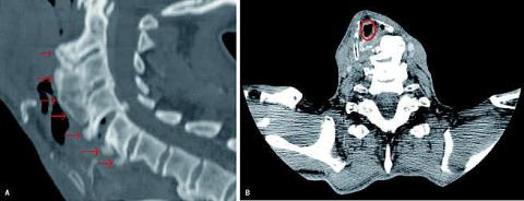 En 62-årig mand blev indlagt til operation for aortaaneurisme. Patienten havde haft let synkebesvær i ca. et år, men ellers ingen øre-næse-hals-gener. Primær intubation var vanskeliggjort af dislokation af trachea. Ved fiberskopi blev der fundet en tumorproces i hypopharynx, en biopsi viste knogle. Efter få dage blev patienten genindlagt med tiltagende stridor, konfusion samt hallucinationer, og der blev foretaget akut trakeostomi. En skanning viste udtalt osteofytdannelse anteriort og i mindre omfang posteriort på columna i C2-C7 (A ). Trachea blev forskudt lateralt (B ). I samarbejde med neurokirurgisk afdeling blev der afmejslet osteofytter. Herefter kunne larynx mobiliseres og optimalt placeres. Postoperativt var der ingen respiratoriske problemer, og trakealkanylen kunne seponeres inden udskrivelsen.
