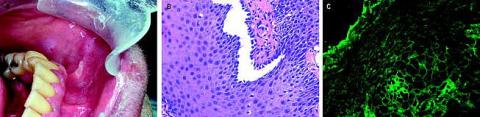 En tidligere rask 53-årig mand fik vedholdende smertefulde erosioner i mundhulen (Figur 1A ) En biopsi bekræfter diagnosen pemphigus vulgaris.