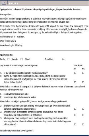 Formålet med undersøgelsen blev forklaret for patienten både i tale og på skrift. Patienterne blev spurgt om: 1) køn og alder, 2) om de ønskede at deltage i undersøgelsen, 3) om de tidligere var blevet behandlet med akupunktur, 4) om de kunne være interesseret i at modtage behandling med akupunktur for kvalme eller smerter på opvågningen, 5) om de ønskede at modtage behandling med akupunktur før eventuelt medicinsk behandling, 6) om de kun ønskede at modtage behandling med akupunktur, hvis det var videnskabeligt dokumenteret, at det virkede for den pågældende lidelse, og 7) om de gerne ville have mulighed for at modtage behandling med akupunktur som supplement til den traditionelle behandling under hele indlæggelsen på hospitalet. Det udleverede spørgeskema er vist i Figur 1. Såfremt patienten svarede nej til spørgsmål 2) på spørgeskemaet, skulle resten af skemaet ikke udfyldes. Patienten blev i stedet spurgt, om han/hun mente, at akupunktur ikke virkede, om han/hun ikke brød sig om nåle, eller om, der var en anden årsag.