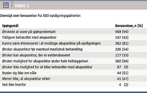 I Tabel 1 ses de overordnede resultater af undersøgelsen. Ud af de 500 adspurgte opvågningspatienter valgte 468 (94%) at svare på spørgeskemaet, heraf var 54% kvinder og 46% mænd (gennemsnitsalder 54 år (spændvidde: 16-92 år)). Blandt de 468 patienter svarede 197 (42%), at de før var blevet behandlet med akupunktur. Godt 81% (382/468) af de adspurgte patienter kunne være interesseret i at modtage akupunkturbehandling for kvalme og smerter. Ud af disse 382 patienter ønskede 206 (54%) at modtage behandling med akupunktur før en eventuel medicinsk behandling. En tredjedel af patienterne (127) ønskede kun at modtage akupunkturbehandling, hvis der var evidens for, at det virkede. Mens 360 patienter (94%) ønskede mulighed for at modtage behandling med akupunktur som supplement til konventionel behandling under hele indlæggelsen. 19% (86 patienter) af de adspurgte ønskede ikke mulighed for akupunkturbehandling. Godt halvdelen af disse (51%) svarede, at de ikke brød sig om nåle, og knap halvdelen (47%) svarede, at de ikke mente, at akupunktur virkede, 2% vidste ikke hvorfor. Gennemsnitsalderen i gruppen, der ikke ønskede akupunkturbehandling, var 57 år mod 53 år i gruppen, der ønskede akupunkturbehandling. Kønsfordelingen viste, at 45 kvinder (18%) og 41 mænd (19%) ikke ønskede mulighed for akupunkturbehandling, mens 176 mænd (81%) og 206 kvinder (82%) ønskede mulighed for akupunkturbehandling.