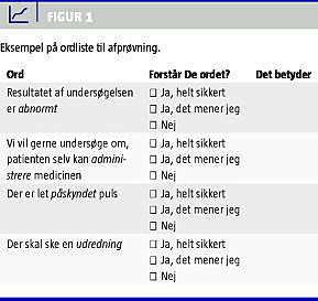 Materiale og metoder: Med udgangspunkt i en undersøgelse af borgernes forståelse af det sprog, som anvendes i skrivelser fra det offentlige, blev der udført en undersøgelse af forståelsen af nogle ord fra skrivelser fra sundhedsvæsenet. Patientinformationer fra en årgang protokoller, der var indsendt til Den Videnskabsetiske Komite for Frederiksberg og Københavns Kommuner, blev gennemlæst, og der blev gennemført 44 individuelle interview med gennemgang af indlægssedler med kursister på 9. og 10. klassetrin på voksenundervisningscentre (VUC). I alt 143 almindelige ord blev udvalgt og testet for forståelse hos i alt 404 andre VUC-kursister. Et ord blev karakteriseret som vanskeligt forståeligt, hvis mindre end 90% forstod betydningen af det.