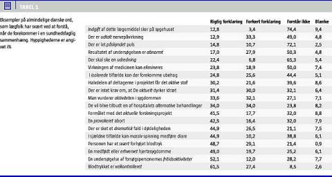 Det skal fremhæves, at et ord som hjerte-kar-sygdomme kun blev forstået af 14%, mens 40,6% gav en forkert forklaring, og 37,2% svarede, at de ikke forstod ordet.