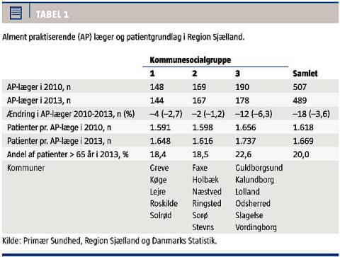 Region Sjælland består af 17 kommuner og havde pr. 1. oktober 2010 507 AP-læger på fuld tid. Lægedækningen blev opgjort 1. oktober 2010 og 1. marts 2013 ved at beregne antallet af patienter pr. AP-læge i hver kommune. Delepraksis blev omregnet til fuldtidsstillinger, og der blev ikke skelnet mellem sygesikringsgrupper, fordi 98% af befolkningen tilhører gruppe 1. Kommunernes befolkningstal blev indhentet for 4. kvartal 2010 og 1. kvartal 2013 fra Danmarks Statistik.