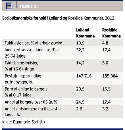 kilde Kommuner. I Lolland Kommune var der i 2013 dobbelt så mange fuldtidsledige og kortuddannede samt næsten tre gange så mange førtidspensionister som i Roskilde Kommune. Desuden var der i 2013 i Lolland Kommune over 30% flere børn af enlige forsørgere og over 40% flere ældre over 65 år. I Roskilde Kommune var der procentuelt flere statsborgere fra ikkevestlige lande, men andelen var relativt lille for begge kommuner.