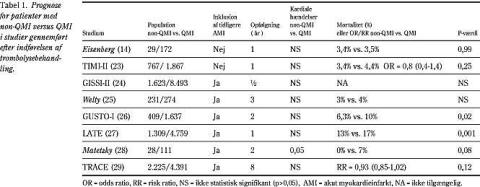 GUSTO-I (Global Utilization of Streptokinase and Tissue Plasminogen Activator for Occluded Coronary Arteries-I), LATE (Late Assessment of Thrombolytic Efficacy) og Matetzky et al's studier (26-28) viste bedre prognose hos patienter med non-QMI end QMI.