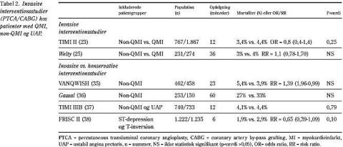 Nogle studier har undersøgt fordelen ved en tidlig invasiv (PTCA eller CABG) versus konservativ behandling hos patienter med non-QMI eller non-QMI samt ustabil angina pectoris (35-37), se Tabel 2. I VANQWISH (Veterans Affairs Non-Q-wave Infarction Strategies in Hospital)-undersøgelsen blev patienter med non-QMI randomiseret til invasiv eller ikke-invasiv behandling (35). Trods et betydeligt cross-over blev prognosen signifikant forværret ved allokering til den invasive arm. Således kan en manglende Q-tak efter AMI ikke i sig selv tilskynde til rutinemæssig invasiv behandling. I TIMI IIIB (Thrombolysis In Myocardial Infarction) blev patienter med såvel ustabil angina som non-QMI randomiseret til invasiv eller ikke-invasiv behandling (37). Dette studie viste ingen forskel i mortalitet, men mindre hospitalisering, ved anvendelse af invasiv behandling (p<0,001). En væsentlig forskel på VANQWISH og TIMI IIIB er inklusion af patienter med ustabil angina i TIMI IIIB, og derfor er resultaterne svære at sammenligne. FRISC II-studiet har for nylig vist, at tidlig invasiv intervention hos patienter med ustabil koronararteriesygdom (ustabil angina pectoris eller non-ST-elevations-AMI) er forbundet med mindre mortalitet og morbiditet (38). Inklusionskriterierne var elektrokardiografisk ST-segment-depression og T-tak-inversion. Q-takker indgik altså ikke i valget af patienter. En vigtig forskel på FRICS II og de øvrige studier er, at der anvendtes lavmolekylært heparin i FRISC II til alle patienter før intervention.