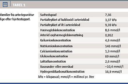 De næste tre dage blev patienten imidlertid tiltagende konfus og usikker på benene. Man foretog derfor en CT af cerebrum (CTC) på mistanke om cerebrale metastaser; denne viste normale forhold, og der blev efterfølgende givet 1 l isoton glukoseopløsning intravenøst pga. manglende væske- og fødeindtag. Senere samme aften registrerede plejepersonalet intermitterende apnø og bevidstløshed, og den vagthavende læge blev tilkaldt. Ved tilsyn ti minutter senere fik patienten bevidnet hjertestop. Hjerte-lunge-redning blev straks påbegyndt, og spontan cirkulation og respiration var opnået to minutter efter. Man havde først mistanke om opioidoverdosering og aspiration, men en arteriepunktur viste derimod en svært forhøjet B-glukose-koncentration på 69 mmol/l. Værdier fra første arteriepunktur ses i Tabel 1. Der blev rekvireret endokrinologisk tilsyn, og diagnosen hyperosmolært hyperglykæmisk syndrom (HHS) blev stillet på baggrund af arteriepunkturen samt urinstiks og blodprøver, der var svagt positive for ketoner. Behandlingen blev påbegyndt efter gældende retningslinjer for HHS, og to timer efter var patienten vågen, relevant orienteret og hæmodynamisk stabil. P-glukoseniveauet var 10,6 mmol/l 12 timer efter påbegyndt behandling, og patienten var i velbefindende og kunne selv spise og drikke. Hun havde ikke tidligere haft nogen form for diabetes. Fire dage efter blev hun udskrevet til eget hjem og fortsat ambulant forløb i onkologisk regi.