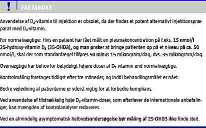Størst risiko for fejlvurdering er der hos patienter med svær D-vitamin-mangel, de får derfor ordineret D-vitamin som en injektionsvæske, der indeholder D2 -vitamin, ergocalciferol. D2 -vitamin var indtil for nylig det eneste danske injektionsvæskepræparat (100.000 IE/ml), men fra september 2011 fremstilles også cholecalciferol (D3 -vitamin) som injektionsvæske (100.000 IE/ml) magistrelt. Herudover kan man efter indhentning af en udleveringstilladelse ordinere et tysk præparat, D3-Vicotrat (100.000 IE/ml) (Tabel 1 ).