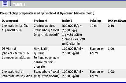 Ud over cholecalciferol til injektion er der i dag mulighed for på recept at ordinere et stærkt D3 -vitamin-præparat til peroralt brug, cholecalciferoldråber 300.000 IE/g, som fremstilles magistrelt (Tabel 1).