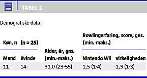 RESULTATER: Med simulatoren kunne det ret præcist måles, hvor godt man bowlede (på simulatoren) - intraclass correlation coefficient = 0,76. Derimod var der overhovedet ingen sammenhæng mellem testpersonernes virkelige bowlingevner og deres score i simulatoren (Pearsons r = 0,06). Vi fandt ingen signifikante forskelle på mænds og kvinders evner.