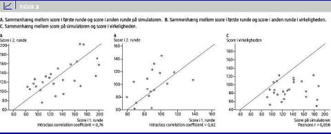 Der var en rimelig god overensstemmelse mellem scoren i første runde og scoren i anden runde på simulatoren - ICC = 0,76 (Figur 3 A). Overensstemmelsen var lidt dårligere i virkelighedens verden - ICC = 0,62 (Figur 3B).