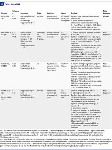 I efteråret 2018 blev der udført en systematisk litteratursøgning på de videnskabelige databaser PubMed og PsycINFO for at klarlægge, hvilke stressreducerende interventioner der er blevet undersøgt i et RCT-design i Danmark. I Tabel 1 vises en oversigt over de fundne studier.