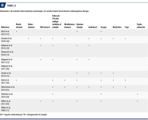 Litteraturgennemgangen viste, at der var udført ni studier, og i alt var otte forskellige stressreducerende interventioner undersøgt. I Tabel 2 illustreres komponenterne i de undersøgte interventioner. Som det fremgår, går flere af komponenterne igen i de enkelte stressreducerende interventioner, men der er stor variation i, hvordan de forskellige komponenter er kombineret på tværs af interventionerne. Det er ikke blot indholdet, der varierer, men også målpopulationen, hvilken behandling kontrolgruppen modtager såvel som effektmålene.