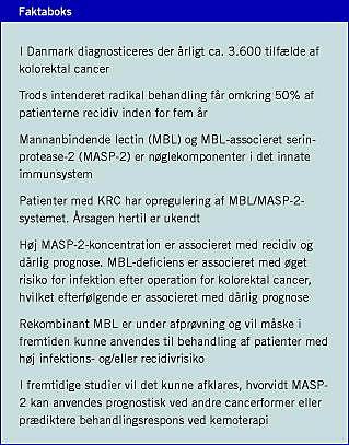 Kolorektal cancer (KRC) er en hyppigt forekommende sygdom. Trods intenderet radikal operation er recidivraten høj og prognosen dårlig. Implementering af nye biologiske markører vil måske kunne optimere behandlingen af patienter med KRC. Serumpro-teinerne mannanbindende lectin (MBL) og MBL-associeret serinprotease-2 (MASP-2) er biologiske markører under validering ved KRC. MBL-deficiens prædisponerer til postoperativ infektion, som er forbundet med dårlig prognose, mens høj præoperativ MASP-2-koncentration er associeret med tidligt recidiv og dårlig prognose.
