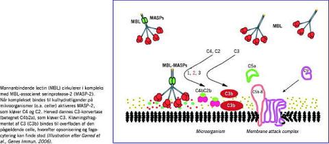 Immunapparatet består af to dele; det adaptive og det innate system. Det innate immunsystem udgør kroppens tidligste forsvar mod indtrængende mikroorganismer. En nøglekomponent er komplementaktivering via MBL -pathway (Figur 1 ). MBL cirkulerer bl.a. i kompleks med MBL-associeret serinprotease-2 (MASP-2). Komplekset binder til kulhydratstrukturer på mikroorganismer [5], apoptotiske celler [6] og cancerceller [7]. Herved aktiveres MASP-2, som initierer komplementkaskaden.