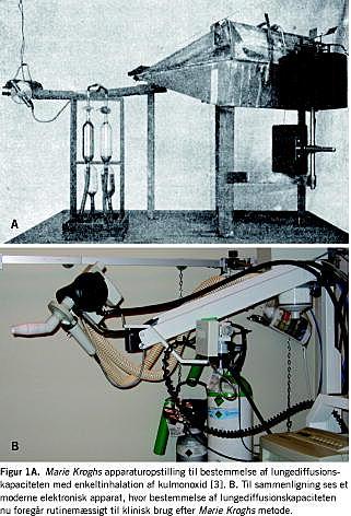 Marie og August Krogh påviste i en række arbejder, udført på Universitetets Fysiologiske Laboratorium i Bredgade 1906-1910, at transporten af ilt og kuldioxid i lungerne foregår ved diffusion [1, 2]. Marie Krogh arbejdede videre med luftudveksling i lungerne på Universitetets Zoofysiologiske Laboratorium og Rigshospitalet og beskrev i sin disputats fra 1914 [3] måling af »lungediffusionskonstanten« (i dag lungediffusionskapaciteten (LDC)). LDC er udtryk for den mængde af en luftart, der pr. tidsenhed og partieltrykforskel kan transporteres over en persons alveolemembran. Marie Krogh anvendte kulmonoxid som testgas, idet såvel transporthastighed som modtryk i blodet kunne bestemmes og kontrolleres for denne gas. Startkoncentrationen af kulmonoxid i alveoleluften blev bestemt ved fortyndingsprincippet, og slutkoncentrationen blev direkte målt (Figur 1 ). Der var på denne tid tale om tidkrævende og vanskelige analyser, men de kunne gennemføres med betydelig sikkerhed. Den nyudnævnte fysiologiprofessor Valdemar Henriques og professor i eksperimentel farmakologi Johannes C. Bock var som officielle opponenter ved disputatsforsvaret enige om, at målingerne var veludført, men at de ikke som sådan tilførte respirationsfysiologien noget nyt [2]. Dette skulle vise sig at være en meget forenklet konklusion. Bestemmelse af LDC var på grund af de tidkrævende analyser helt overvejende egnet til videnskabelig anvendelse, og blev relativt sjældent udført gennem de efterfølgende 50 år.