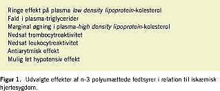 Marine n-3 polyumættede fedtsyrer indbygges i celler og væv efter indtagelsen. Herfra frigives de efter aktivering og metaboliseres til thromboxan A3 i trombocytter og til leukotrien B5 i leukocytter. Disse produkter (eikosanoider) er mindre aktive end dem, der stammer fra en kost indeholdende de mere udbredte n-6 polyumættede fedtsyrer [2], der metaboliseres til proaggregratorisk og vasokonstriktivt thromboxan i trombocytter og til proinflammatorisk leukotrien B4 i leukocytter. Ved at øge kostens indhold af n-3 polyumættede fedtsyrer på bekostning af n-6 polyumættede fedtsyrer fås derved en relativ antiaggregatorisk og antiinflammatorisk effekt. En konsistent effekt efter indtagelse af marine n-3 polyumættede fedtsyrer er desuden et fald i plasmatriglycerider, hvilket primært er betinget af en nedsat produktion i leveren af very low density lipoproteins [2]. En øget indtagelse af n-3 polyumættede fedt-syrer til mere end 2 g pr. døgn (og gerne endnu højere) er derfor et reelt alternativ til behandling med fibrater, såfremt hypertriglyceridæmi ønskes farmakologisk behandlet. Udvalgte effekter af marine n-3 polyumættede fedtsyrer fremgår af Figur 1 . Disse effekter kan påvises ved indtagelse af 1-2 g daglig af n-3 polyumættede fedtsyrer og er generelt gunstigere, jo højere indtagelsen er.