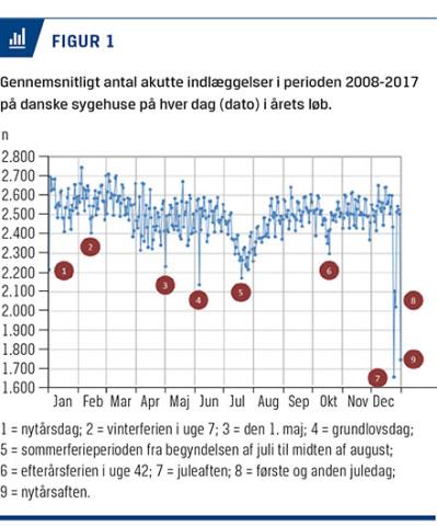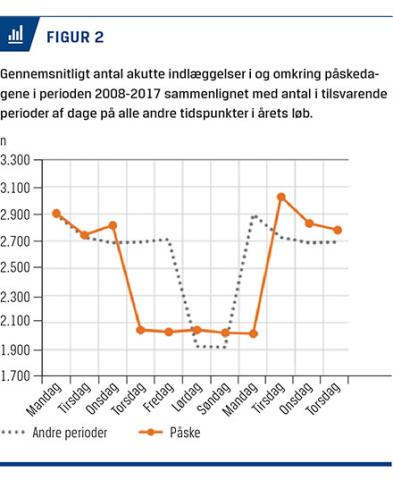 Det er tankevækkende, at det gennemsnitlige antal akutte indlæggelser på danske sygehuse typisk er 20-30% lavere i weekender, på helligdage og i ferieuger end på årets 61% øvrige dage, og at der tilsyneladende ikke, som vist for påskedagene i Figur 2, forekommer kompensatoriske stigninger i antallet af akutte indlæggelser efter fridagene.