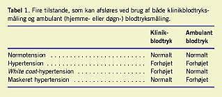 Med to forskellige måder at måle blodtrykket på, hjemme og i konsultationen, fremkommer der fire grupper af patienter: 1) »sandt« normotensive patienter, som er normotensive med begge metoder, 2) »sandt« hypertensive patienter, som er hypertensive med begge metoder, 3) white-coat- hypertensive patienter og 4) patienter, der har »maskeret« hypertension og kun har forhøjet blodtryk hjemme/ambulant (Tabel 1 ).