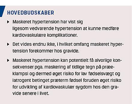 Maskeret hypertension må haves in mente hos gravide, der har lejlighedsvist forhøjet blodtryk, men er normotensive i klinikken. Maskeret hypertension må også haves in mente ved blodtryk i den høje ende af normalområdet, særligt i første halvdel af graviditeten. For at belyse, om vi underdiagnosticerer behandlingskrævende hypertension i graviditeten, har vi behov for yderligere undersøgelser af de gravides døgnblodtryk sammenholdt med de målte blodtryk i klinikken både hos højrisikogravide og ikke mindst hos kvinder med tilsyneladende ukomplicerede graviditeter.