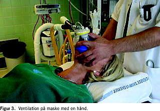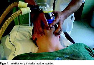 Man vælger en maske af passende størrelse, dvs. en maske, som kan dække næse og mund. Masken placeres over næse og mund på patienten, og man holder med venstre eller højre hånds første og anden finger oven på masken, mens tredje, fjerde og femte finger placeres under patientens kæbe (Figur 3 ). Første og anden finger skal udøve et tryk ned mod ansigtet, således at masken slutter tæt, de tre øvrige fingre skal holde kæben oppe, så man derved skaber en fri luftvej. Det er vigtigt at placere sine fingre på den benede del af kæben, da der ellers er risiko for luftvejsobstruktion, hvis man presser for hårdt mod basis af tungen. Patientens hoved kan vippes bagover for yderligere at åbne luftvejen, men dette gøres dog ikke, hvis der er risiko for instabilitet af cervikalcolumna, f.eks. hos traumepatienter. Et korrekt greb giver en åben luftvej og en tætsluttende maske, så ventilationen bliver så effektiv som muligt. Det kan være nødvendigt at lægge en pude under patientens hoved for at få den optimale lejring. Hos mindre børn er baghovedet forholdsvis stort, så her er en pude ikke nødvendig. Tværtimod kan det hos de mindste være en fordel at lægge en pølle under thorax.