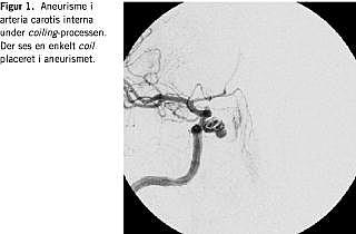 To dage senere blev patienten atter indbragt pga. akut epistaxis i hjemmet, blødningen var ophørt inden ankomsten til hospitalet, og patienten blev optransfunderet med fire portioner blod. Der blev foretaget rinoskopi med optik, og computertomografi (CT) af bihulerne. Bortset fra sløring i sinus sphenoidalis viste disse undersøgelser normale forhold. På denne indlæggelses ottende dag blev patienten fundet bevidstløs på gulvet efter fornyet epistaxis, anslået blødning ca. to liter. Hun blev optransfunderet med syv portioner blod, og der blev foretaget sinoskopi i universel anæstesi. Ved denne blev der set en blodstribe fra ostiet ud for sinus sphenoidalis, hvorfor dennes forvæg blev reseceret. I bunden af sinus sphenoidalis fandt man uregelmæssigt pulserende væv, og opera-tionen afsluttedes. Efterfølgende blev der foretaget magnetisk resonans (MR)-angiografi som viste et 1 cm stort aneurisme, der udgik fra a. carotis interna på højre side. Patienten blev overflyttet til Røntgendiagnostisk Afdeling på Odense Universitetshospital, hvor en arteriografi viste et topuklet aneurisme, der udgik fra højre a. carotis internas medial og forvæg og derfra eroderede ned i sinus sphenoidalis. Der blev i samme seance foretaget coiling af aneurismet via a. femoralis (Figur 1 ). Der opstod kortvarig central facialisparese, venstresidig svælgparese og venstresidig positiv babinskirefleks. Ved kontrol et halvt år efter coiling blev der fundet normale neurologiske forhold, og der var ikke siden blødningsepisoder. En kontrolarteriografi viste, at aneurismet var vellukket.