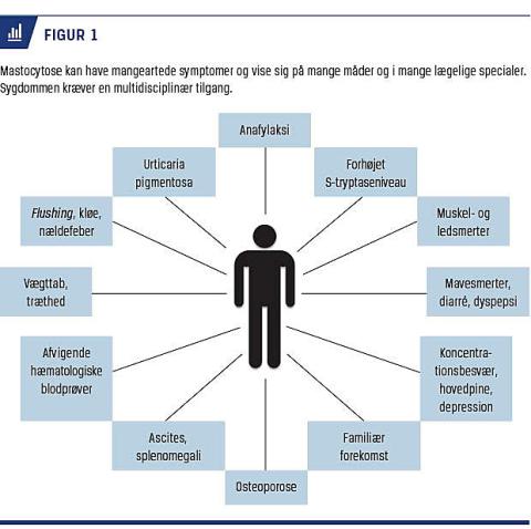 Mastocytose kan vise sig ved mangeartede symptomer, såsom anafylaksi, kløende hudelementer, uforklaret diarré og mavesmerter, tidligt indsættende osteoporose, bevægeapparatsmerter, koncentrationsbesvær, depression samt træthed og vægttab, og dermed indgå som differentialdiagnose til mange tilstande (Figur 1).