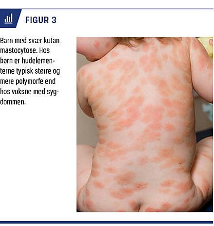 gastrointestinale (kolikagtige mavesmerter, diarré og dyspepsi), neuropsykiatriske (hovedpine, depression, koncentrations- og hukommelsesbesvær) og reumatiske (muskel- og ledsmerter). Fælles for disse er, at der er symptommæssigt overlap med andre sygdomme, og patienter, der har mastocytose og sådanne symptomer, bør udredes koordineret og multidisciplinært for differentialdiagnoser [23]. Omvendt er de ikke typiske debutsymptomer på mastocytose uden andre samtidigt forekommende typiske symptomer såsom UP eller anafylaksi. Mastocytose må dog som anført opfattes som underdiagnosticeret, og den reelle forekomst af sygdommen hos patienter med f.eks. langvarig, uforklaret diarré og uforklarede kognitive eller reumatiske symptomer er ikke belyst. Det må derfor anbefales, at mastocytose her indgår tidligt i de klinisk-differentialdiagnostiske overvejelser.
