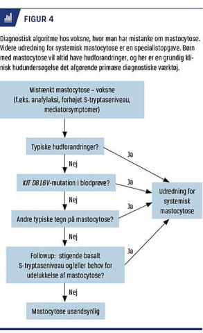 Hos voksne, hvor sygdomsbilledet ofte er langt mere komplekst, anbefales en trinvis, initial udredning ved mistanke om mastocytose (Figur 4). Primært efterses huden grundigt for de typiske hudelementer (UP), som kan være diskrete. Hvis disse er til stede, anbefales patienten henvist til nærmere udredning på et center med specialkompetence i mastocytose. Typisk gennemføres der knoglemarvsundersøgelse til afklaring af diagnosen SM, vurdering af mastcellebyrde og afklaring af evt. associeret hæmatologisk neoplasi. Hvis der ikke er hudforandringer, anbefales det at foretage KIT D816V-mutationsundersøgelse med højsensitiv teknik af en blodprøve [4, 26]. Hvis denne er positiv bør patienten viderehenvises til nærmere udredning som ovenfor anført. Hvis mutationsundersøgelsen af blod er negativ,