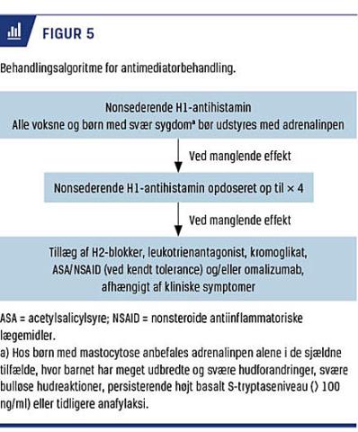 Hos børn anbefales dette alene i de sjældne tilfælde med meget udbredte og svære hudforandringer, svære bulløse hudreaktioner, persisterende høj basal S-tryptaseniveau (> 100 ng/ml) eller tidligere anafylaksi [17, 27, 28]. Behandling og opfølgning bør individualiseres afhængig af sygdomsmanifestationerne og forløbet hos den enkelte patient. Overordnet inddeles behandlingsstrategien i antimediatorbehandling rettet mod mastcellens mediatorer og cytoreduktiv behandling rettet mod nedbringelse af antallet af neoplastiske mastceller. Et forslag til en behandlingsalgoritme for lægemidler rettet mod mastcellens mediatorer er anført i Figur 5. Nonsederende H1-blokkere, evt. opdoseret, vil oftest være tilstrækkeligt til at kontrollere symptomerne [23].