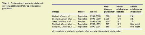 Resultaterne fra fem nyere studier om risikoen for medfødte misdannelser i graviditeter med prægestationel diabetes er vist i Tabel 1 . Risikoen for at få børn med medfødte misdannelser i disse fem populationer af gravide kvinder med diabetes var 5,0-11,9%. I ældre studier er der fundet både højere og lavere risiko for medfødte misdannelser end i de her nævnte studier [2].
