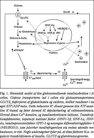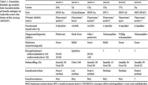Allerede før »insulinæraen« havde man kendskab til juvenile former for diabetes, hvor patienterne overlevede i årevis uden insulinterapi (1). Eksistensen af denne juvenile, ikke-insulinkrævende diabetessubgruppe blev igen bekræftet, da man fandt, at sulfonylurinstoffer normaliserede glukosemetabolismen hos nogle børn og unge med diabetes (1). I 1975 introducerede man termen MODY efter at have erkendt den familiære ophobning af denne specielle form for diabetes. MODY er karakteriseret ved familiær diabetes, hvis kliniske træk mere ligner type 2- end type 1-diabetes, tidlig sygdomsdebut (barnealder, pubertet eller tidlig voksenalder) og autosomal dominant arvegang. Patienterne er oftest slanke, har nedsat insulinsekretorisk kapacitet, og i modsætning til patienter med klassisk type 2-diabetes er MODY-patienter karakteriseret ved ikke at være insulinresistente (2). Man har i mange år været klar over, at MODY klinisk set er heterogen. Fundet af store familier med denne form for diabetes har muliggjort klassiske genetiske koblingsstudier. Disse studier har vist, at MODY også genetisk set er heterogen, idet seks kromosomale loci, benævnt MODY1-MODY6, er vist at være koblet til MODY-fænotypen. Gennem de sidste otte år er de seks forskellige MODY-gener påvist (Tabel 1): MODY1, hepatocyt nukleær faktor (HNF)-4α; MODY2, glukokinase; MODY3, HNF-1α, MODY4, HNF-1β; MODY5, insulinpromotorfaktor (IPF)-1 og MODY6, NEUROD1/beta2.