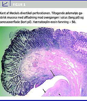 Patoanatomisk fandtes i divertiklet udbredt ektopi af gastrisk mucosa af korpustype samt fokus af ektopisk pankreasvæv, og der var forandringer svarende til perforation i et kronisk ulcus (Figur 1 ) med akut peritonitis og periappendicitis.