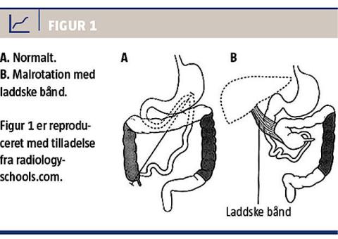Malrotation skyldes mangelfuld eller ufuldstændig rotation af den primære intestinalslynge hos embryonet. Malrotation af mellemtarmen medfører en forkortelse af tarmens mesenterium og forårsager ændringer af tarmens lejring, hvilket øger risikoen for volvulus. Tilstanden er associeret med ændringer i tarmens fiksering og med dannelse af fibrøse peritoneale strøg, laddske bånd, som kan forårsage duodenal obstruktion (Figur 1) [1].