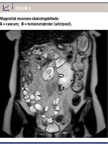 En ultralydskanning af øvre abdomen viste normale forhold. På baggrund af en colonindhældning foretaget 13 år tidligere blev der rejst mistanke om malrotation. Efterfølgende MR-skanning og computertomografi (CT) viste malroteret colon med caecum placeret til venstre for midtlinjen i umbilikalniveau. Skanningen viste desuden torsionsmønster i tyndtarmskrøset beliggende i højre øvre kvadrant, vægfortykkelse af duodenum og inflammation i krøset i det torkverede område (Figur 2). Patienten blev efterfølgende indkaldt til laparoskopisk deling af de laddske bånd, hvor man verificerede diagnosen. Der blev foretaget deling af et langstrakt fladt bånd mellem colon ascendens/caecum og duodenum/lever/laterale bugvæg samt detorkvering af mesenteriet. Operationen forløb planmæssigt med et ukompliceret postoperativt forløb.
